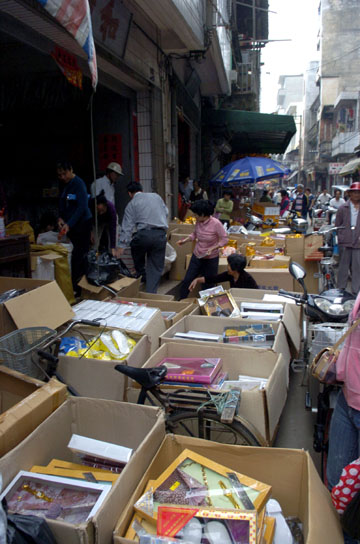 ?谑姓駯|街道路兩旁布滿了兜售祭祀用品的商店。小到紙錢、元寶、金條,大到汽車、飛機、別墅,品種繁多。掃墓祭祀時這些紙制品不僅污染環境,還極易形成山火隱患。本報記者:郭程
