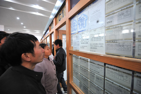 農民工正在杭州市外來勞動力服務中心仔細查看招工信息。本報記者:傅丕毅