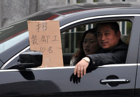 一名企業主開著私家車招農民工。本報記者:傅丕毅
