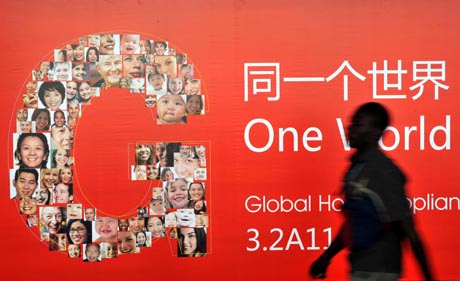 一位廣交會的客商經過格蘭仕公司的廣告燈箱。本報記者 壯錦