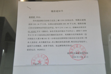連日來,所有購房人分別收到了溫州市舊城改建指揮部的《繳款通知書》,限定他們于6月30日前繳納房款差價,每平方米大多需繳款3000元以上,繳款后簽訂房屋買賣合同,逾期不辦理繳款、結算手續的,依法解除購房協議。