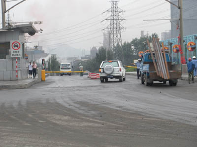 大貨車進進出出,10多根煙囪吞云吐霧。蒙蒙雨霧中,偌大的通鋼廠區繁忙而又安靜。如不親臨現場,很難相信兩周前這里曾上演過一場致人非命的怨恨“泄洪”。唯一能夠找到的“潰口”蹤跡,是通鋼明珠廣場地面上,被涂料覆蓋但依稀可辨的標語:“建龍滾出通鋼”。