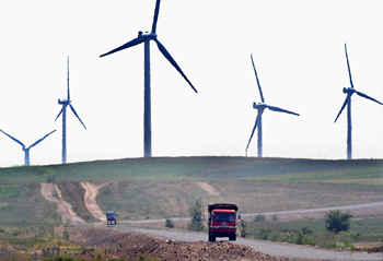 兩輛汽車行駛在內蒙古自治區境內風力發電機組臨近的公路上。新華社記者王頌  攝