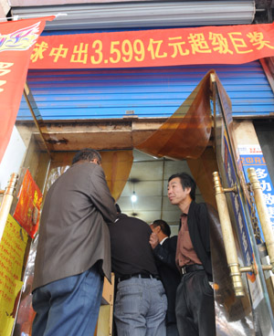 開出3.6億巨獎的河南安陽這家彩票投注站在門頭上懸掛出宣傳條幅。這家投注站因為沾了巨額大獎的喜氣,生意紅紅火火,營業額成倍攀升,不少外省市的彩民專程跑到這里購買彩票,期望能夠碰上好運氣。