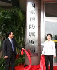 9月13日上午,國家預防腐敗局揭牌儀式在監察部舉行。這是國家預防腐敗局局長馬馬文(右)和國家預防腐敗局副局長屈萬祥在揭牌儀式上。新華社記者:李濤 攝