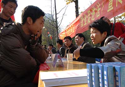 12月2日,余姚市勞動部門工作人員(右)在受理一名男青年的咨詢。當天是浙江省余姚市規定的“外來務工人員日”,為了配合即將頒布的新《勞動合同法》宣傳,余姚市工會及勞動和社會保障部門的法律專家走上街頭,義務為外來務工人員宣傳新法,并提供咨詢服務。