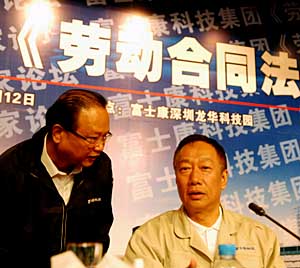 | 富士康科技集團12日在深圳舉行《勞動合同法》專題論壇,邀請勞動部、國臺辦、全國總工會等相關部門的專家解答了企業和員工的疑問。富士康表示,將積極實施《勞動合同法》,與數萬已連續工作8年以上的員工簽訂無固定期限勞動合同。富士康科技集團總裁郭臺銘(右者)在研討會上表示,富士康將積極實施《勞動合同法》,全力推動有富士康特色的勞動合同制度,創造勞資雙贏、留住人才的局面,同時積極履行《勞動合同法》規定的法律責任,做到合法經營。新華社記者