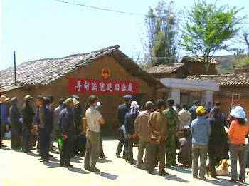 10日,在云南省尋甸回族彝族自治縣大水塘村,縣法院在村子的一片空地上,掛起了莊嚴的國徽,多名法警在現場維持著秩序,一名審判長、一名書記員、加上原告和被告以及雙方辯護人,組成了一個在基層農村開庭的巡回法庭。