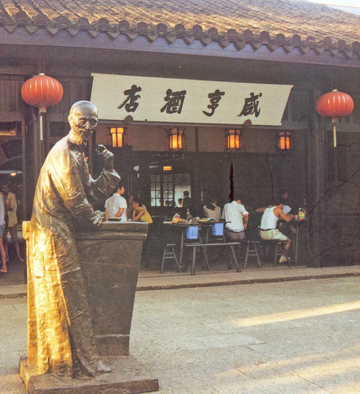 魯迅活著時,為了寫作,長年累月地咳嗽、咳痰、咳血;魯迅長年沒有固定的月薪收入及“灰色收入”,只是個自由撰稿人,靠一個字一個字地在燈下爬格子換取收入。 魯迅死后,魯迅的姓名、肖像甚至連其筆下的人物、地名都成了財富。咸亨酒店、魯鎮茶座、百草園飯店、阿Q酒家,在紹興市比比皆是。冠以三味、百草園、祥林嫂、孔乙己、阿Q、華老栓的商店及商品充斥紹興,像孔乙己茴香豆、魯鎮牌醬鴨、七斤嫂烏干菜等還注冊了商標。 有商業眼光的人士敏銳地意識到魯迅小說《孔乙己》中“咸亨酒店”這4個字的含金量,便依照小說中描寫的格局在魯迅路上修建了咸亨酒店,在酒店門口放置了孔乙己塑像。游覽紹興的國內外游客慕名而來,“咸亨”成了中國馳名商標,財源滾滾。 據紹興市工商局統計,該市以魯迅作品中的人名、地名作企業名稱或商標的已達300多件。