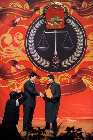 1月15日,浙江省高級人民法院的25名高級法官及26名審判員舉行授職宣誓儀式,以加強法官的榮譽感和職業精神,促進法官堅守良好的職業道德,確保司法公正,維護國家法制尊嚴。新華社記者徐昱