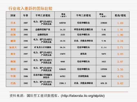與國際相比,日本最高比值是1.69倍,英國是1.91倍,法國1.96倍,德國2.23倍,加拿大2.71倍,巴西比較高是5.62倍。我們總是擔心中國陷入拉美式的經濟陷阱,然而,根據國家統計局發布的今年第一季度最新行業平均工資數據,可以計算出我國收入最高的行業是證券業,是全國平均水平的5.9倍,金融業是平均工資的3倍。而較低的木材加工業只有全國平均水平的53.6%,紡織業是全國平均水平的55.5%,農副產品是60.1%,最高與最低行業平均工資之比是11比1,遠遠超過巴西。