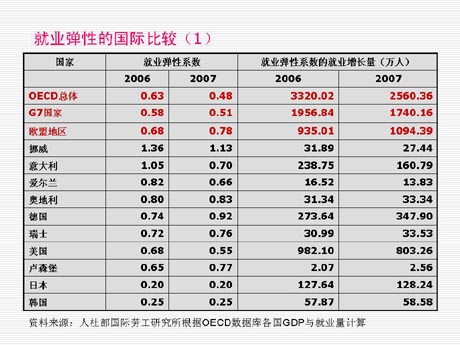 再和國際上進行比較,根據人力資源和社會保障部國際勞工研究所對OECD數據庫和各國GDP就業量的計算,一般發展中國家就業彈性平均在0.3-0.4,發達國家2007年歐盟地區總就業彈性是0.78,OECD國家是0.48。這說明我們這種經濟增長方式對帶動就業的促進作用,與發達國家相比差太多了,中國基本上是全世界就業彈性最低的國家。