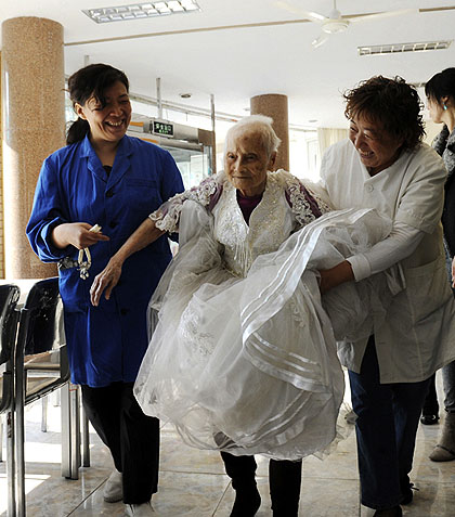 圖為10月13日,在養老院等多方面的努力下,重陽節前夕,居住在天津和平區鶴壽養老院的101歲老人陳來槺終于圓了自己多年來拍寫真的夢。新華社發(劉東岳 攝) |