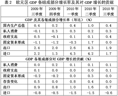 發達經濟體被迫改變負債消費模式。長期以來,以美國為首的發達國家主要靠消費來拉動經濟增長。其中,美國個人消費支出占經濟總量的2/3以上。今后這種基本格局雖然不會改變,但以住房次級按揭貸款形式為標志的負債消費和過度消費模式已經難以為繼。美國消費信貸2010年連續7個月放緩,美國民眾的消費習慣有所改變,傾向于更為謹慎。在歐元區,長期居高不下的失業率和人口老齡化加劇了居民消費的低迷。而且,歐元區各國為了遏制主權債務危機所采取的財政緊縮政策,如增加稅收、減少補貼等,又對居民消費產生明顯的抑制作用。在日本,2010年前三季度的數據表明,民間最終消費的增長速度低于民間企業投資和貨物勞務出口的增長速度,居民消費仍然疲軟。在消費不振的情況下,發達經濟體的緩慢復蘇更多得益于投資與出口。美國采取量化寬松的貨幣政策,促使美元貶值,加上奧巴馬政府提出的“再工業化”和“出口倍增計劃”,一定程度上刺激了經濟恢復并弱化了經濟增長對消費拉動的依賴。從表1可以看出,2010年前三季度,美國個人消費的增長速度都低于私人國內投資和出口。從表2可以看出,2010年上半年特別是二季度,歐元區經濟加速復蘇主要得益于出口的迅速恢復。日本的情況也是如此。