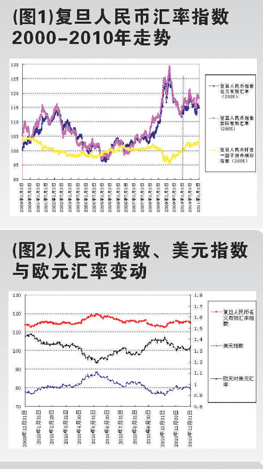 事實上,2010年復旦人民幣名義有效匯率指數和實際有效匯率指數波動呈現為兩個明顯的上升和下降階段;盯住一籃子貨幣模擬指數則呈現緩慢平穩上升趨勢。