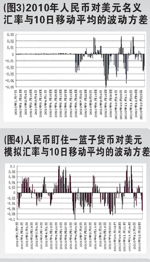 這是重啟匯改增強人民幣匯率彈性的結果。圖3和圖4分別顯示了2010年人民幣對美元匯率模擬值與實際值與其10日移動平均線的波動方差。從中可見,匯改之前人民幣兌美元匯率基本沒有波動,匯改以后,波動幅度明顯加大,但與盯住一籃子貨幣模擬匯率比較,其波動幅度仍然偏小,其平均方差僅0.00385,而后者為0.0242。而且人民幣兌美元匯率波動存在較明顯的偏向,向下波動較大,而向上波動太小。因此,進一步增強人民幣對美元匯率彈性,特別是雙向波動幅度,不僅有利于增加熱錢炒作人民幣匯率的風險,而且有利于減少人民幣有效匯率的波動,降低其對進出口貿易的不利影響。