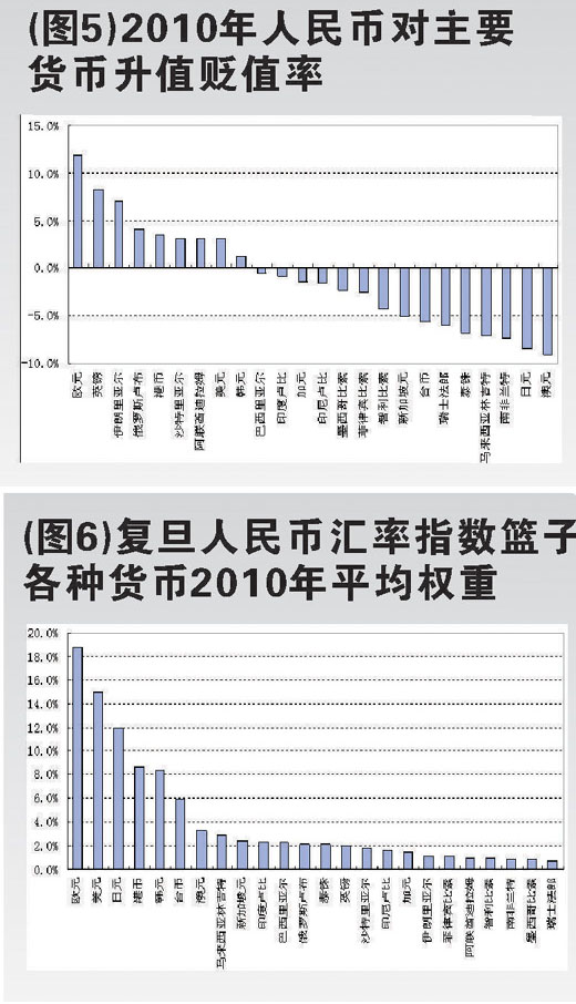 2010年復旦人民幣匯率變動主要受歐元、美元、日元、港元、澳元等貨幣變動的影響。圖5顯示了2010年人民幣對24種主要貨幣升值貶值情況。人民幣對歐元升值最大,達11.84%,其次為英鎊8.18%;對澳元貶值最大為9.1%,其次為日元8.4%。
