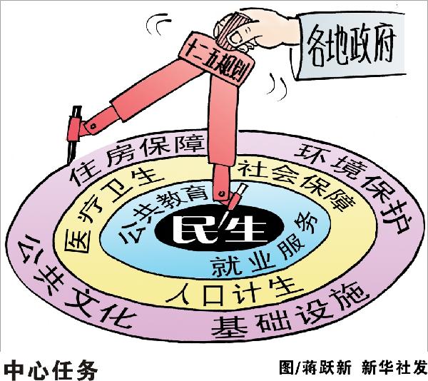 就業與社會保障、教育、醫療、住房等,在13億人口的國度里每一個都是世界級的難題。民生問題解決得好壞,關系著人民的福祉,關乎著民主的前途,決定著國家的命運!笆濉币巹澗V要明確提出:堅持把保障和改善民生作為加快轉變經濟發展方式的根本出發點和落腳點。完善保障和改善民生的制度安排,把促進就業放在經濟社會發展優先位置,加快發展各項社會事業,推進基本公共服務均等化,加大收入分配調節力度,堅定不移走共同富裕道路,使發展成果惠及全體人民。新華社發