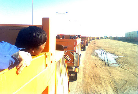 | 2月26日,中鐵十一局五公司組織員工撤離利比亞鐵路項目工地,分乘數十輛工程車,組成車隊前往利比亞米蘇拉塔港。新華社發(梁勝利
