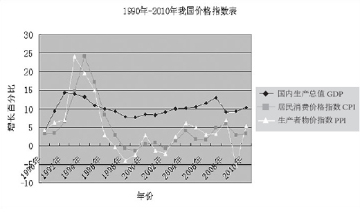 經濟增長速度過快,需求旺盛,必然促使價格上漲,形成通脹壓力,甚至出現嚴重通脹。相反,如果把經濟增長速度控制在適度范圍,需求較平穩,成本就會得到控制。因為增長速度得到控制,勞動力、能源、原材料需求就不會過大,價格就不會上漲。歷史數據提供了佐證。如圖,從1990年到2010年的21年間有10年GDP增長率在10%以下,這10年中只有3年CPI在3%以上,其余7年CPI都在3%以下;而在GDP增速超過10%的11年中只有3年CPI在3%以下,其余8年都在3%以上。尤其是1992—1995年,GDP超常增長,進入11%—15%區間,CPI隨之進入6%—25%的區間。PPI上漲率與GDP增長率之間也存在類似關系。