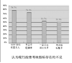 總的來看,大多數受訪廳局級領導干部認為現有政績考核方式不利于轉變經濟發展方式。那么,現行考核方式中存在哪些不足呢?調查結果顯示,78.7%的領導干部認為“反映GDP增值的指標權重太大”。74.7%的領導干部選擇“重顯績輕潛績”,致使有些地方熱衷做“表面文章”,民眾無法有效共享發展的成果。53.7%的領導干部選擇“‘一票否決’項目太多”,地方領導有時畏手畏腳,難以全力以赴推動轉變經濟發展方式。51.9%的領導干部選擇“考評指標繁多”。