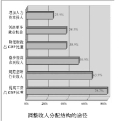 關于怎樣調整收入分配結構?78.7%的領導干部建議“改善勞資關系,著力提高工資在GDP中的比重”。63.9%的領導干部建議應該“規范壟斷行業收入,對國有企業進行‘分紅收租’”,表明壟斷行業職工收入過高是已成為收入改革必須攻克的堡壘。50.9%的領導干部認為要“切實提高農民收入”。38.9%的領導干部認為應“明顯降低財政在GDP中的比重,降低行政成本”,政府應該讓民眾更多地分享經濟發展的成果。38.9%的領導干部認為要“改善就業環境,增加就業機會”,表明就業是增加低收入者收入的有效途經。25.9%的領導干部認為要“加大人力資本投入,使勞動者作為財富創造者的能力普遍提升”,表明通過教育加大人力資本投入,可以為未來縮小收入差距奠定基礎,但對當前的影響不是很大。