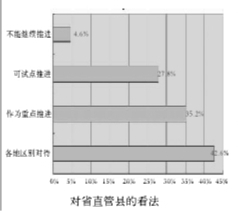 “十二五”期間是否應該實行省直管縣的行政體制,42.6%的領導干部認為應“根據各地區實際情況區別對待,不宜在全國采取同一種模式”。35.2%的領導干部認為“具備條件,并且應當作為‘十二五’行政體制改革的重點之一”。27.8%的領導干部認為“條件尚不成熟,可以試點推進,但是不宜全面鋪開”。4.6%的領導干部認為“這項改革弊大于利,不能繼續推進”。