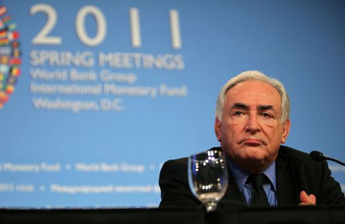 5月14日,國際貨幣基金組織(IMF)總裁多米尼克·斯特勞斯-卡恩因涉嫌對酒店女傭進行“性侵犯”在美國紐約被拘捕。 圖為4月14日,斯特勞斯-卡恩在美國首都華盛頓出席新聞發布會的資料照片。(記者