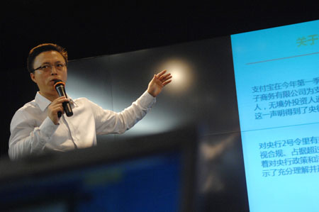 6月14日,阿里巴巴董事局主席兼首席執行官馬云就支付寶所有權變更事件在杭州舉行媒體溝通會。圖為支付寶副總裁井賢棟在媒體溝通會上介紹支付寶股權變更情況。記者