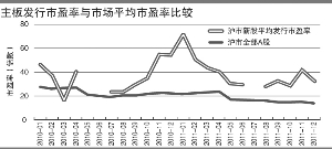 圖三:滬市發行市盈率與市場平均市盈率比較