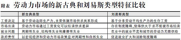中國勞動力市場正在從二元經濟所對應的模式轉向與新古典經濟相對應的模式,勞動力市場的表現既存有二元經濟特征又表現出一定的新古典模式特點。因此,在認識二元經濟下勞動力市場性質的基礎上,也需要把握新古典模式下的勞動力市場的相關特征,因為過去階段的一些特征仍然存在,而后者在一定程度上也是轉型的目標所指。我們可以嘗試借鑒這兩種分析框架來認識當前問題。我們先把新古典模式的勞動力市場與劉易斯勞動力市場類型進行對比(見附表)。通過對比,我們可以了解,當前我們的勞動力市場特征既不是純粹的二元經濟結構,也不是典型的新古典模式。