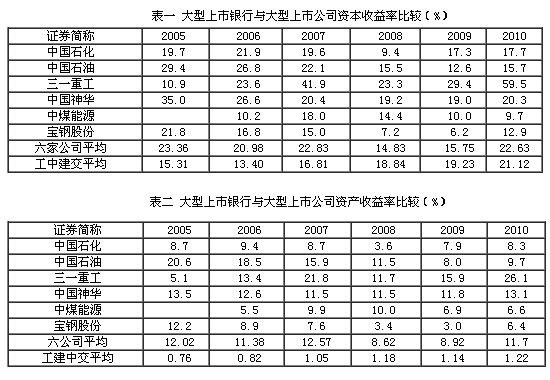 表一、表二中選擇了工中建交四家國有上市銀行和六家實體經濟上市公司,縱向分析它們在2005-2010年期間的效益增長情況。其數據對比說明,六家實體經濟公司不僅平均資產收益率遠遠高于四家國有銀行的平均水平,而且其平均資本收益率在其中的四年內也高于四家國有銀行的平均水平。所不同的是,四家國有銀行的平均資本收益率與資產收益率在六年中呈逐年上升的趨勢,而六家實體經濟公司中,除“三一重工”與“中國神華”外,其他四家的資本收益率與資產收益率均呈現波動明顯、逐年下降的趨勢。
