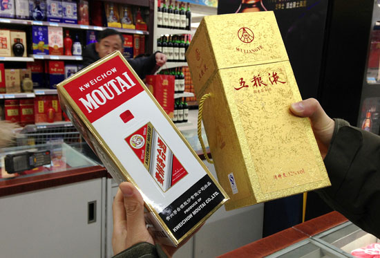 茅臺和五糧液公司因價格壟斷被罰4.49億元,創我國反壟斷史上最大罰單。發展改革委價格監督檢查與反壟斷局副局長張光遠透露,到3月11日前兩公司已全額繳納罰款,相關案件已結案。 圖為商店銷售的茅臺酒與五糧液酒。記者