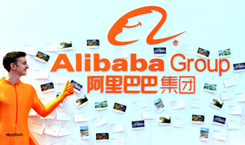 3月17日,德國漢諾威通信和信息技術博覽會中國展區阿里巴巴展臺展示參觀者留言寄語墻板。 記者
