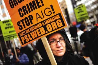 IC圖 | 當地時間3月21日,美國康涅狄格州總檢察長布盧門撒爾表示,經營陷入困境的美國國際集團(AIG)最近分發的獎金實際不止此前聲稱的1.65億美元,而是2.18億美元。 與此同時,美國各地民眾抗議AIG的風潮迭起。圖為洛杉磯的抗議者舉著“該死的AIG”標牌游行。AIG發放巨額獎金引發美國民眾強烈不滿。 根據最新資料,有73名美國國際集團的高級員工每人拿到的獎金超過100萬美元,其中5人的獎金更是超過400萬美元。據報道,布盧門撒爾已要求該公司就此作出解釋。 布盧門撒爾說,最新的獎金數據將使民眾對美國國際集團行為更加憤怒,因為他們認為這些員工不僅不應該得到獎金,而應該被掃地出門。 美國國際集團是美國金融危機的始作俑者之一,為避免該公司破產從而加劇金融危機,美國政府先后向該公司提供了1700億美元的救助資金,并控制了美國國際集團80%的股權。但該公司不久前以“履行合約”為由,宣布向員工支付了1.65億美元的高額獎金,招致美國上下的強烈批評。