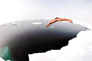 為了宣傳全球變暖的影響,素有“北極熊”之稱的英國探險家劉易斯·戈頓·皮尤15日挑戰“在最冷水中游泳”的人體極限紀錄,暢游了1公里并成為在北極游泳的第一人,而他全身所有的配備只有泳裝、泳帽和護目鏡。 北極裸泳1公里 7月15日,劉易斯·戈頓·皮尤只穿一條游泳褲、戴著一頂泳帽和一個護目鏡,在北極零下1.8攝氏度的刺骨冰水中暢游了19分鐘。據悉,零下1.8攝氏度的北極水溫是人類游泳史上遇到過的最寒冷的水溫。皮尤總共在冰水里前進了1公里的距離。 雖然北極的水溫在0攝氏度以下,但較高的鹽含量使這里的水還沒凍結起來。 在游泳結束離開冰水之后,皮尤的體溫降到了36.5攝氏度,20分鐘之后甚至降到了35攝氏度。但在洗了一次暖水澡之后,他的體溫很快就恢復了正常。 據報道,現年37歲的皮尤被人稱作是“北極熊”,因為他是世界上唯一一個在五大洋中進行過長距離游泳的人。 據悉,他之所以要到北極進行破紀錄游泳挑戰,是為了宣傳全球變暖對環境的影響,從而引起世人對氣候問題的關注。