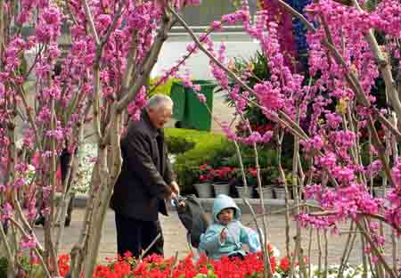 一位推著童車的老人從一片紫荊花前經過。新華社記者:王頌