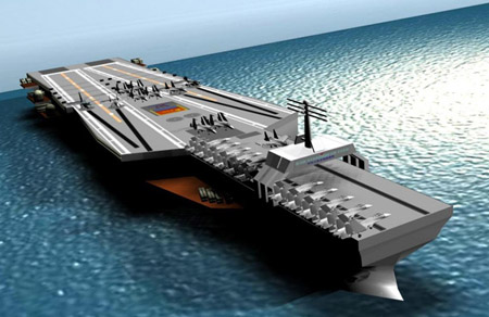 | 網友設計的中國海軍航母想象圖。 | 【中央軍委委員、海軍司令員吳勝利上將日前在接受新華網采訪時透露,中國海軍將研制新一代艦艇飛機。要進一步加大裝備的現代技術含量,必須加快推進重點武器裝備建設步伐,研制大型水面戰斗艦艇等新一代武器裝備。此前,中國國防部長梁光烈2009年3月20日與到訪的日本防衛大臣濱田靖一會談時表示,中國是唯一沒有航母的大國,中國不可能永遠不擁有航母。這樣的表態被海外媒體解讀成是中國政府首次公開宣布航母建造計劃。據有關專家估算,如果中國建造一艘自用的航空母艦,并為其配備完整的戰斗編隊,恐將花費上百億元。在當前這個國際經濟不振、國內經濟面臨考驗的時候,上百億元的采購大單,毫無疑問會對中國經濟起到助推和加速作用!