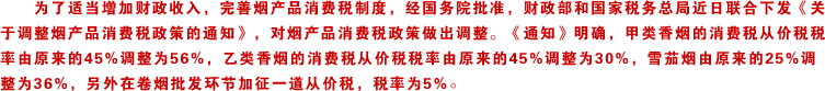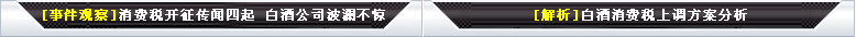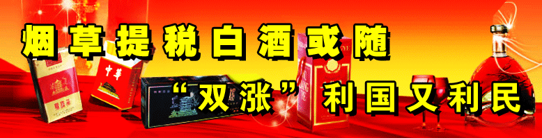 | 香煙消費稅大幅度提高后,白酒消費稅也面臨著上調。盡管白酒消費稅調整方案尚未正式發布,從各種跡象來看,“結構性增稅計劃”已悄然從香煙和白酒開始。今年3月份,國家權威人士就放出口風,倘若出現財政收入不能完成計劃的情況