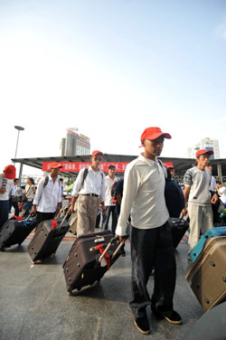 甘肅臨夏組織勞務人員赴海外“淘金”,圖為臨夏州勞務人員走進蘭州火車站。新華社記者:聶建江