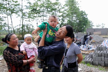 5月10日,黃長容、王興林夫婦和他們地震后降生的兒子王俊杰與鄰家的小妹妹在一起。他的兒子和這個小女孩都是“再生育全程服務行動”下出生的“地震寶寶”。新華社記者 陳燮 攝