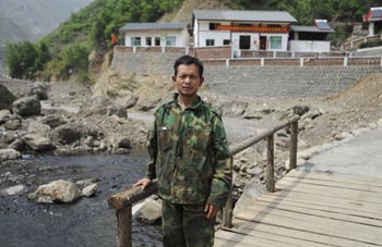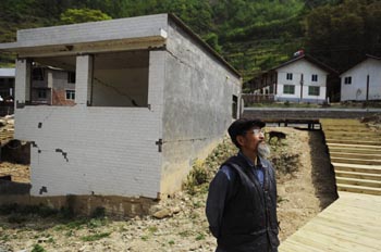 2010年4月30日,80歲的楊林生老人遙望遠方,他身后右側是地震被毀壞的房子(如今已經納入東河口地震遺址保護范圍),左側是重建的三間木結構新房。