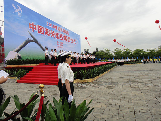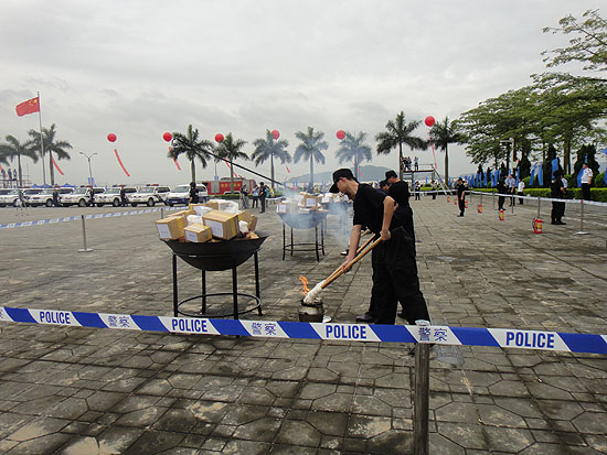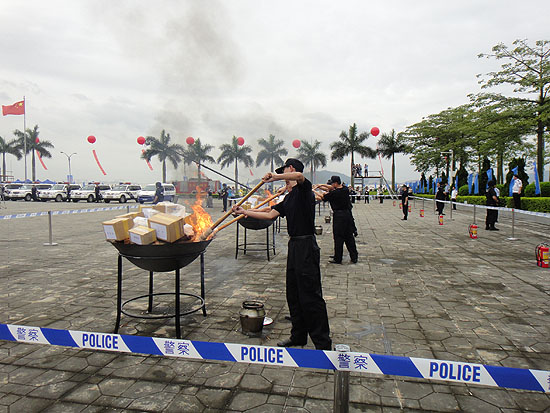 6月26日是國際禁毒日。 6月25日,廣東虎門。因當年林則徐“虎門銷煙”而聞名于世的這一地區再次聚焦了國內外關注的目光。 這一天,海關總署在這里召開中國海關銷毀毒品現場會,現場銷毀海洛因3750包共1033.36公斤!督洕鷧⒖紙蟆酚浾咴诂F場看到,波光粼粼的海面上,一艘艘緝私艇傲然排列,地面方陣由6個海關人員方隊、12輛緝私警車、2輛海關查驗車組成,每輛車前都站著一名全副武裝的緝私警察和一條機警的緝毒犬。最惹人注目的,是地上那用塑料袋包裝得整整齊齊、一包一包鋪滿了整個籃球場那么大地面的海洛因。 隨著海關總署盛光祖署長的一聲令下,八個銷毀爐同時點火,艦艇、警車同時鳴笛,令多少走私分子趨之若鶩、鋌而走險的海洛因在騰起的火焰中煙消云散。那一刻,氣氛如此威嚴,如此震懾。 截至今年5月底,全國海關共查獲走私毒品案件657起,繳獲各類毒品共計2433.5公斤,抓獲犯罪嫌疑人721名。特別是去年下半年以來,深圳、黃埔海關連續在貨運渠道查獲多起特大走私海洛因案,繳獲海洛因達1噸以上,取得了海關貨運渠道查緝毒品走私的重大突破。其中黃埔海關偵破的“10.9”系列特大毒品走私案,是新中國成立以來海關查辦的最大的海洛因走私案。