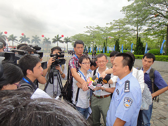 | 海關總署25日上午在廣東虎門舉行儀式,銷毀全國海關近年來查獲的上噸走私毒品。圖為海關辦案發言人在接受記者采訪。 |