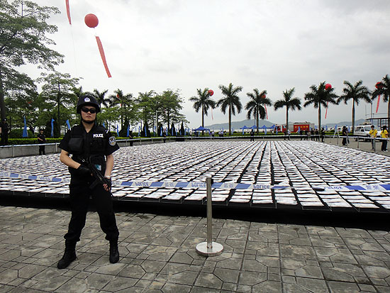 | 海關總署25日上午在廣東虎門舉行儀式,銷毀全國海關近年來查獲的上噸走私毒品。圖為現場準備銷毀的海洛因。 |