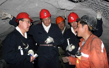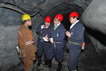 雞西分公司總經理孫若山(左二)在井下考問工人安全生產知識。(資料照片)