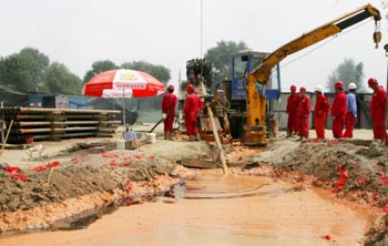 塔輪天然氣管道復線成功穿越中國最長內陸河。施工人員正在現場作業(8月8日攝)。新華社發(陳士兵 攝)