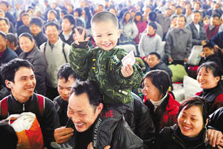 | 1月18日,福州火車站候車大廳,小旅客李卓堯坐在爺爺的肩膀上檢票進站。李濤