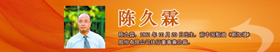 | 人物背景 | 陳九霖,1961年10月20日出生,前中國航油(新加坡)股份有限公司執行董事兼總裁。在他執掌期間,中國航油凈資產由17.6萬美元增至1.5億美元,增幅852倍,市值超過11億美元,是原始投資的5022倍,締造了一個商業傳奇,因此被稱為“航油大王”。2004年,中國航油因澳大利亞籍交易員紀瑞德和英國籍交易員卡爾瑪從事油品期權交易導致巨額虧損。陳久霖本人因此被迫離職,并遭到新加坡警方拘捕。2006年3月,新加坡初等法院做出判決,判處陳久霖入獄服刑四年零三個月,其判刑原因是股東售股拯救公司和公司沒有向交易所呈報虧損。陳久霖在新加坡服刑1035天后,于2009年1月20日刑滿出獄。