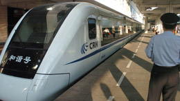 4月18日,中國鐵路第六次提速啟動,11組65對D字頭列車行駛在廣深線上,其中直達D字頭列車7對,全程僅需52分鐘。廣州至深圳每天有85趟列車以每十分鐘一趟的頻率營運,使這兩個相距147公里的城市真正進入一小時生活圈。圖為在廣州火車東站,一列“和諧號”高速列車準備出發開往深圳。